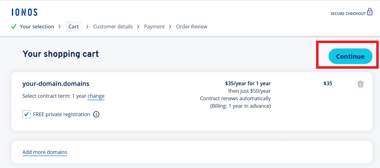 At IONOS, you also have the option to select a suitable product at this stage. Alternatively, simply click the button if you are only interested in the domain.