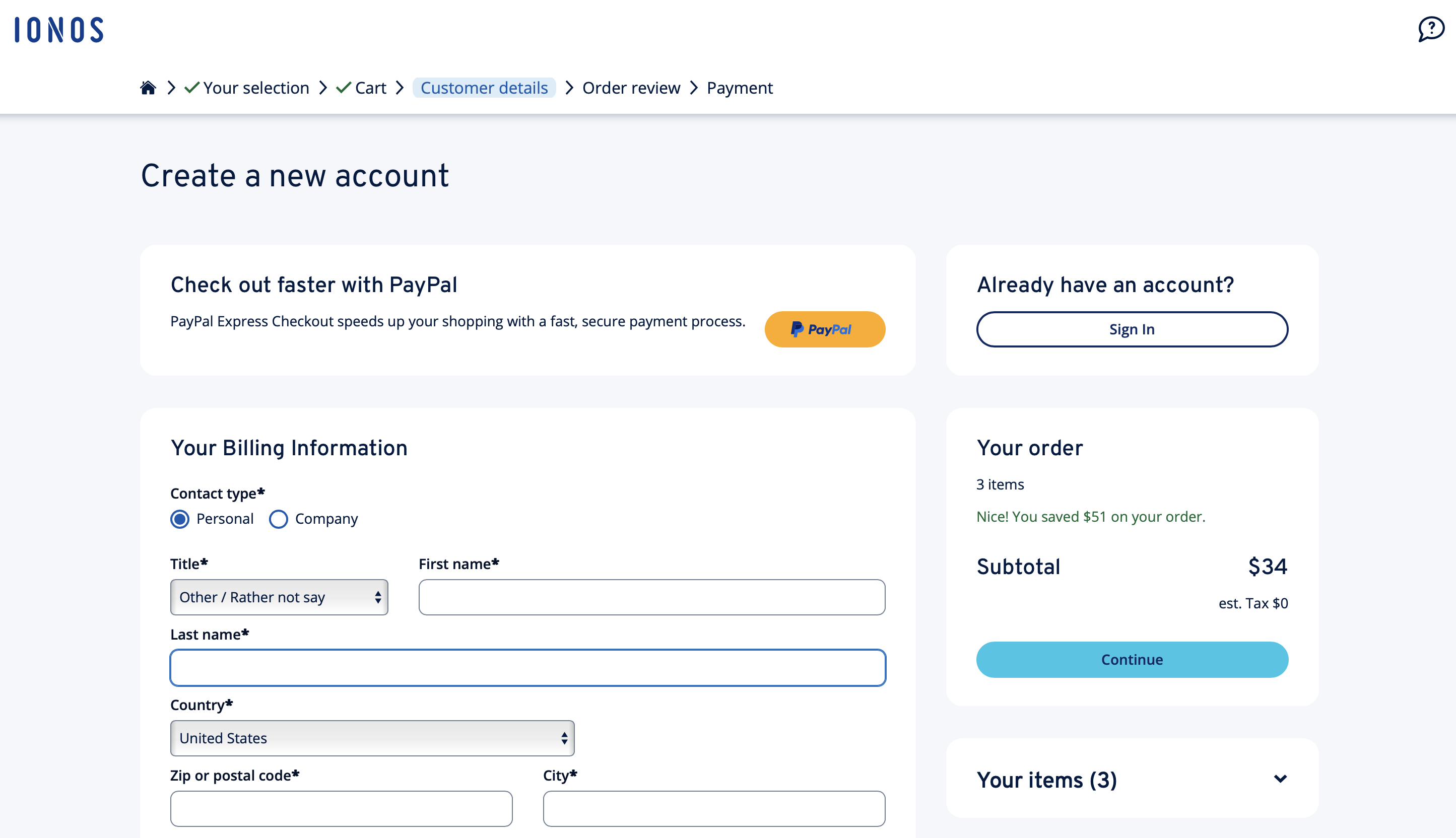 After clicking “Continue”, create a IONOS account or log into your active IONOS account to proceed with the payment processing. You can also pay for your domain(s) directly via PayPal, Apple Pay, or Google Pay.