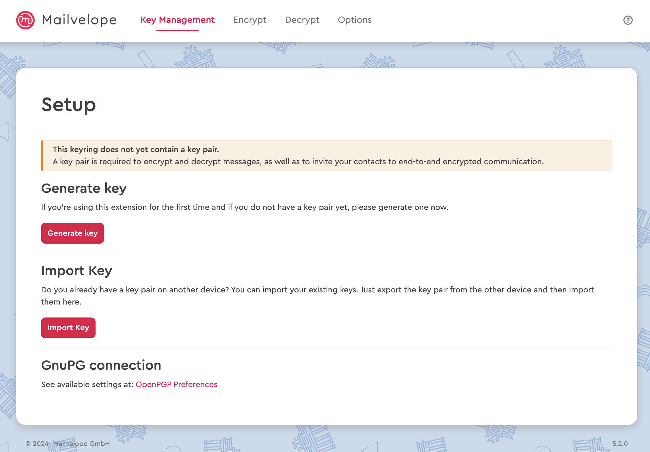 If you prefer to communicate via webmail services like Gmail, Yahoo, or Outlook.com will find the Mailvelope browser extension to be just right. The add-on is based on OpenPGP.js and is available for Google Chrome, Microsoft Edge, and Mozilla Firefox. Once you have installed the extension, the Mailvelope icon appears in your browser’s toolbar, allowing you to access the user interface. Here you can create, import, and manage your keys, as well as the public keys of your contacts, or upload created public keys to a public key server.