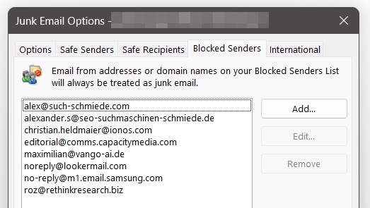 The “Blocked Senders” list shows all email addresses currently blocked. To manually add an address, click “Add”. You can remove any address by clicking “Remove”.