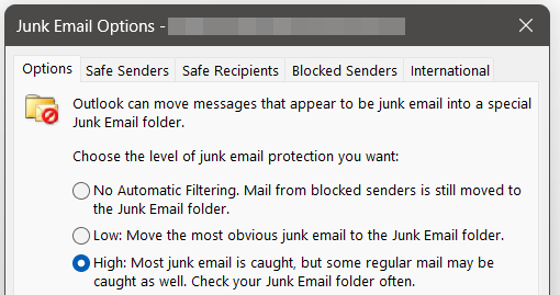 - Set the protection level to either “Low” or “High” to enable the Outlook spam filter.