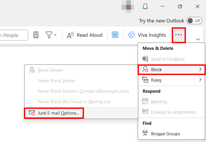 If a spam email isn’t automatically flagged, right-click it in your inbox, then choose “Junk” followed by “Block Sender”.