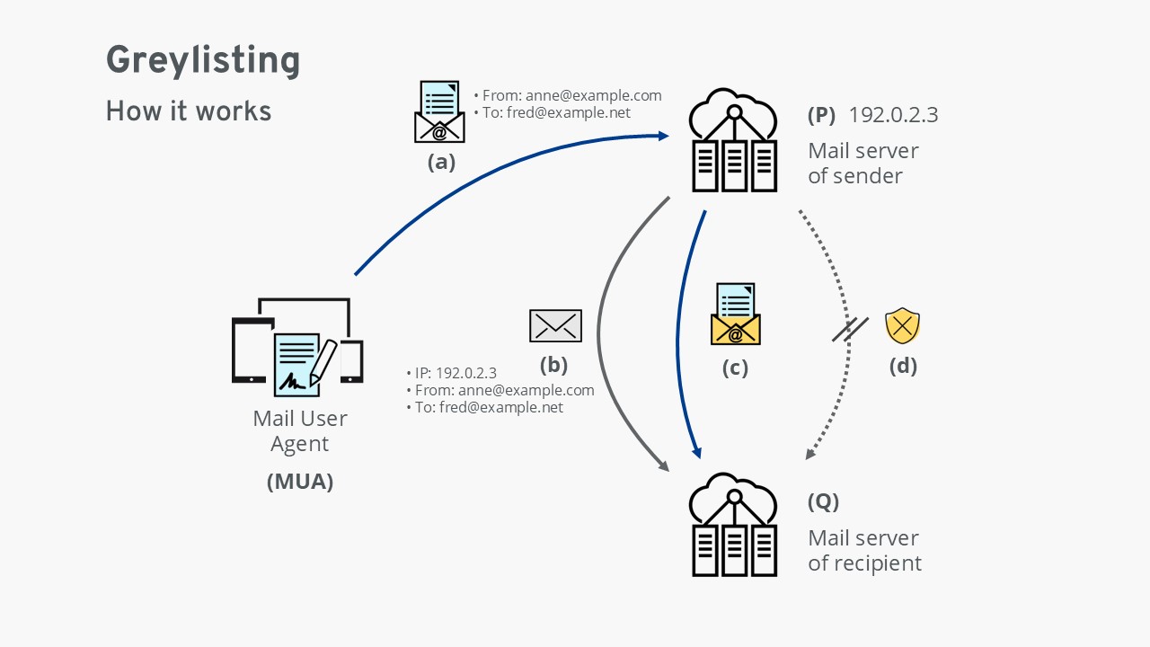 (b) The sender’s mail server (P) forwards the email to the recipient’s mail server (Q). At this stage, server Q checks the email’s envelope data: the IP address of the sending server and the associated email addresses. If this combination is unfamiliar, server Q temporarily rejects the email with a technical error and records the envelope data in a table. The message is now “greylisted.”