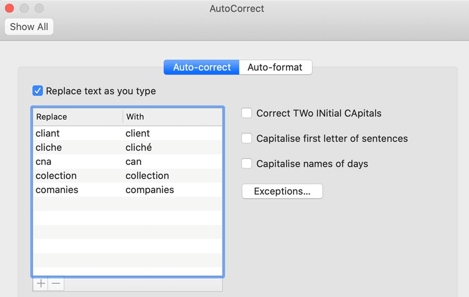 Step 4: Select Exceptions … to view which abbreviations should not be followed by automatic capitalization. Add further exceptions as required.