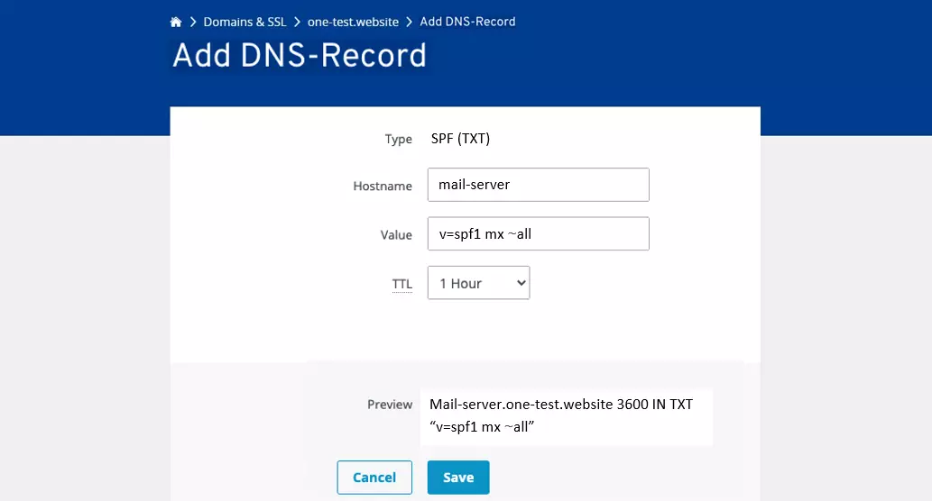 mail.example.com) that you defined underhostnameanddomainnamein yourdocker-compose.yml. - SPF Record: A TXT record for the domain (not for the hostname!), e.g.,