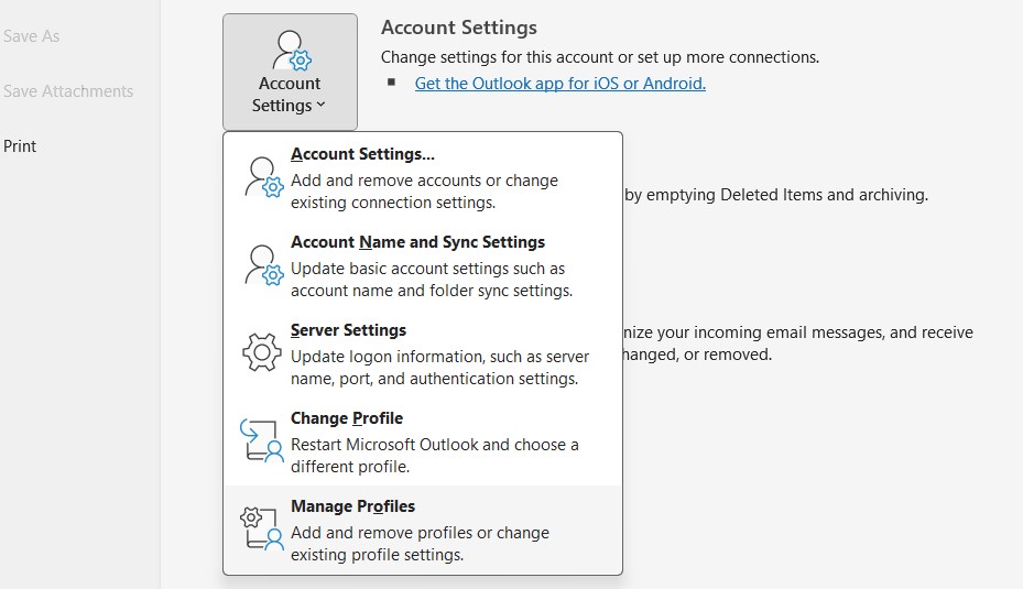 To set up or change the SMTP server in Outlook, first open Microsoft’s email client and then click the “File” tab. Next, select “Account Settings” and then “Manage Profiles”.