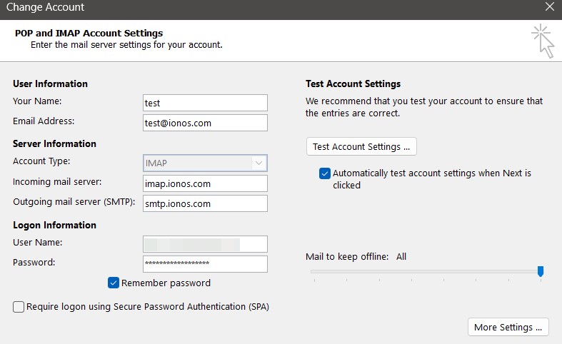Under “Outgoing mail server,” you can now enter the SMTP server of your choice, such as the IONOS SMTP server smtp.ionos.com.