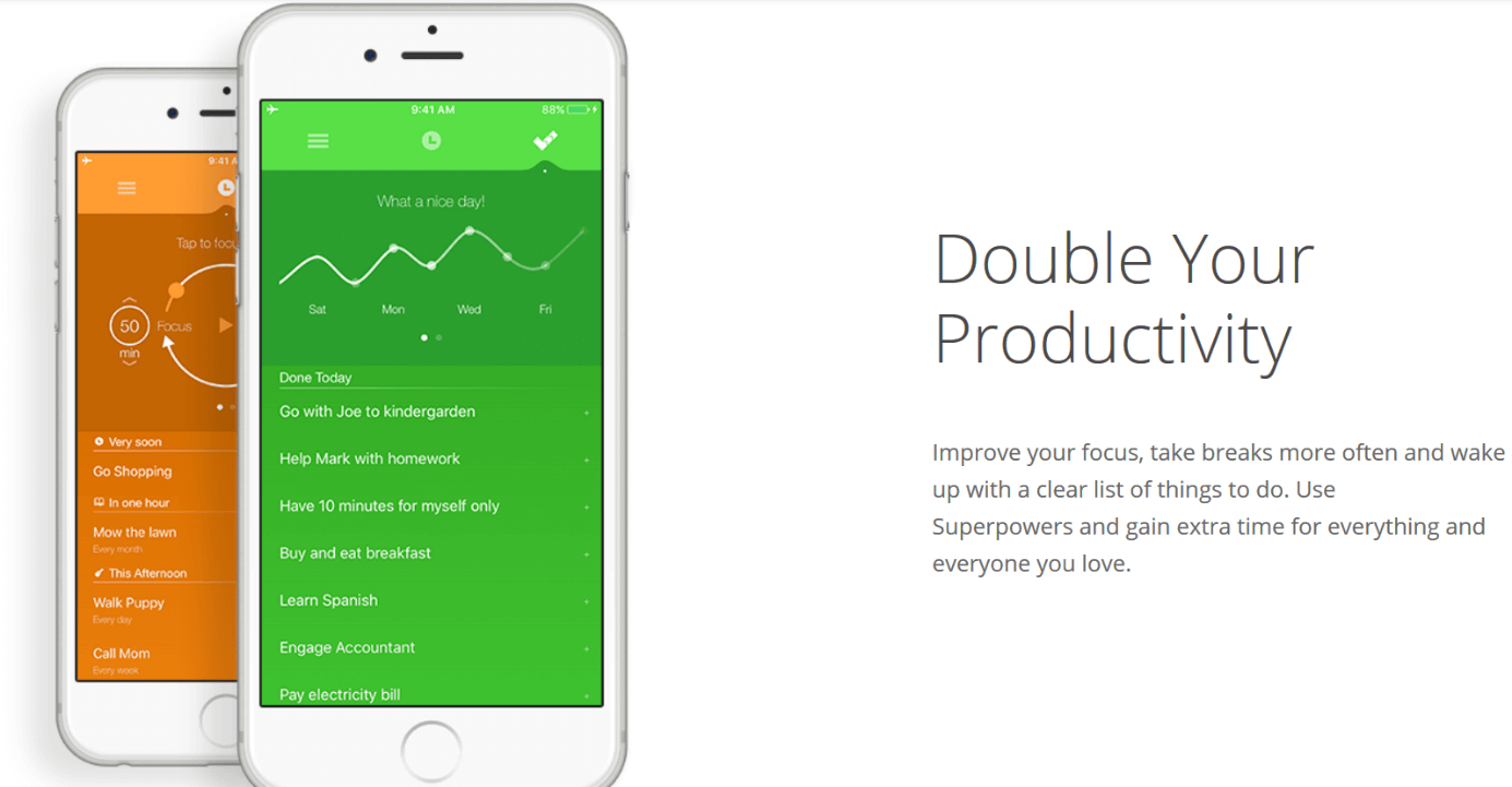 Once your task is complete, it will be moved to the completed task area, where you can find a history of all the entries you’ve ever made (“travel back in time”). At the same time, a chart is created to show you how productive you’ve been in a given time. The app uses animations and sounds to try to motivate and reward you for completing tasks. Other interesting features include the share function for social media and password locking. Proud is available in several languages.