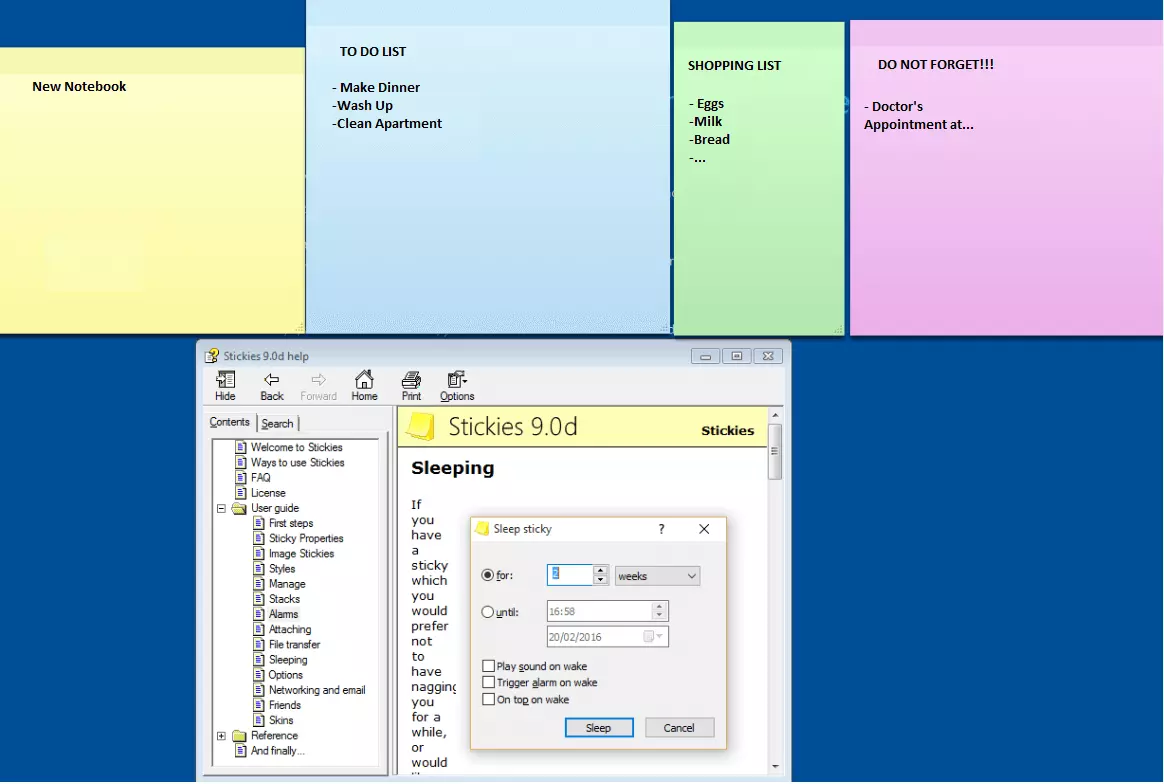 However, Stickies has a lot more to offer than classic sticky notes. The reminder function draws your attention to particularly important notes using a small audio alert. Additionally, the software offers the option of putting individual notes in the “sleep mode” for a certain time, thereby making them invisible. If you only require notes for a specific application (like your e-mail inbox), you can link them together. If you do this, the virtual sticky notes only become visible when you start the corresponding program.