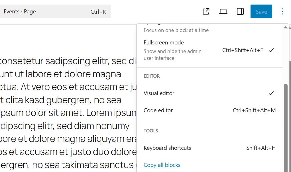In the WordPress backend, open the page or post you want to copy. To do this, click on “Pages” and then “All Pages” in the left sidebar. For the page you want to copy, click “Edit” to open it in the Gutenberg editor. Once there, click the three stacked dots in the top-right corner. In the menu that appears, select “Copy all blocks.”