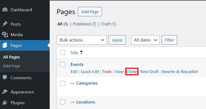 After clicking “Clone,” the duplicated page (or post) will appear as a draft under the original page. In this guide, we duplicated the “Categories” page. You can edit the draft as you like and then publish it. To avoid confusion from the start, you should first change the page name.
