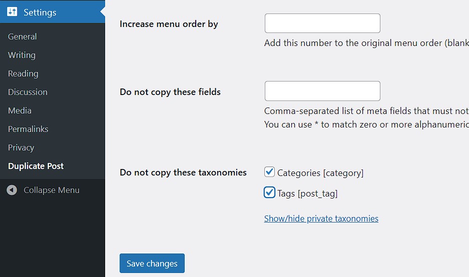 After installing and activating Yoast Duplicate Post, go to “Settings” in your WordPress backend and click the “Duplicate Post” button that appears after installation. There, you can adjust which elements of a page or post should or shouldn’t be copied. If you’re unsure which options to select, it’s best to keep the default settings and test by duplicating a page or post.