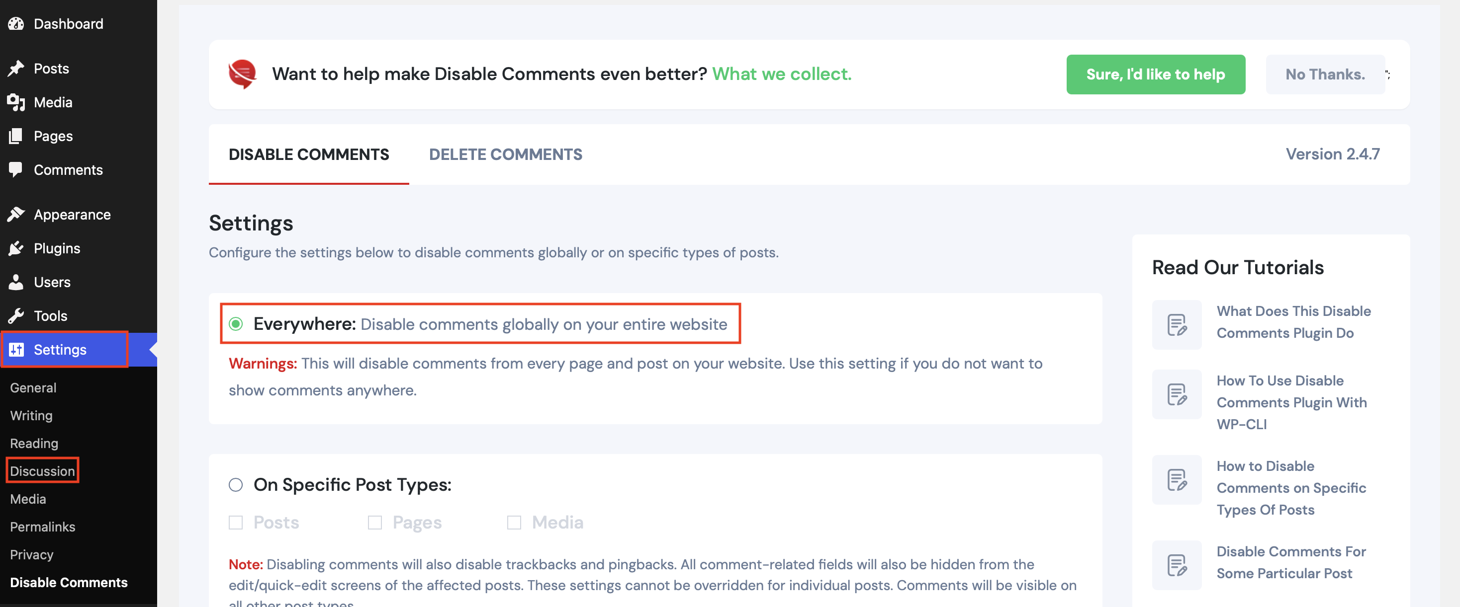 WordPress offers several easy ways to disable and manage comments. However, if these aren’t sufficient, you can install a plugin designed specifically for this purpose. One of the most popular choices for making WordPress comments disappear is “Disable Comments” by WPDevelopers – it’s currently installed on more than one million WordPress sites! The plugin is ideal if you’re looking for a quick and easy way of disabling comments, and removing all comment-related controls and settings from both the frontend and the backend.