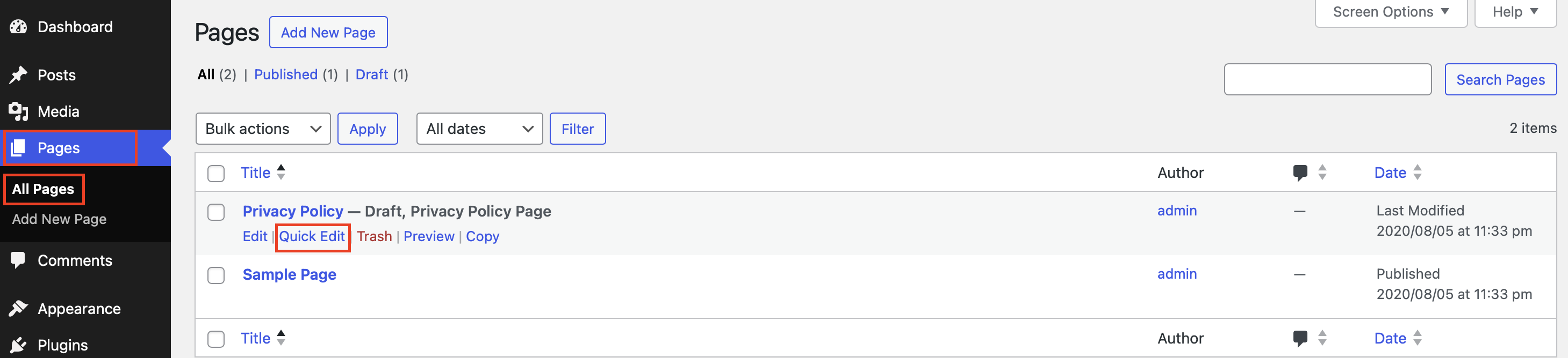 Step 2: Now move your cursor over the page where you want to enable (or change) the comment function. Several options will appear under the page name—click on “Quick Edit.”
