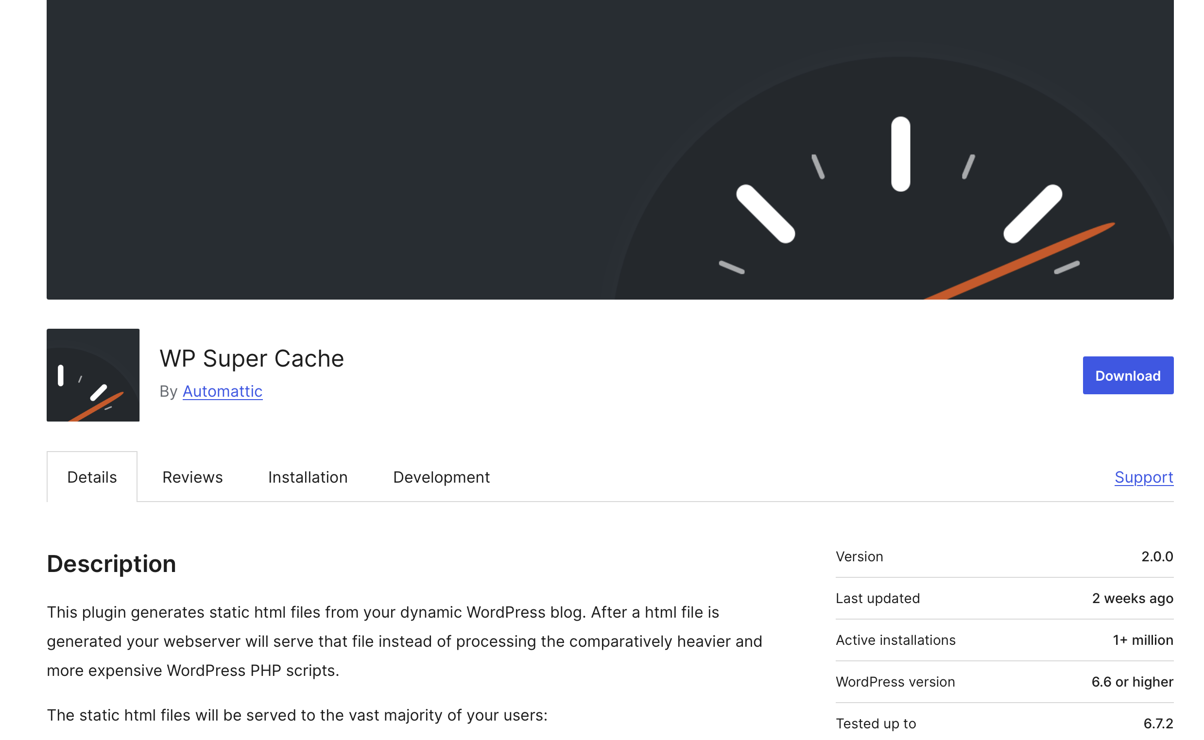 The development of the WP Super Cache plugin comes from the same company that runs WordPress. This is why it is considered the official WordPress caching plugin among WordPress users. Its biggest advantage is that it generates static HTML pages. Unlike retrieving data from the database, this allows the browser to display the page significantly faster.