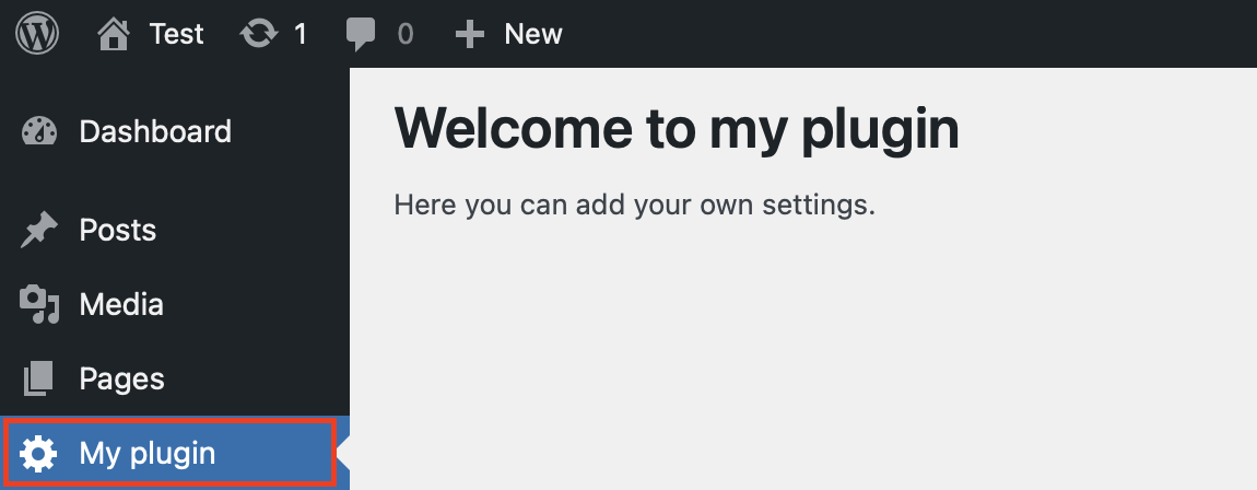 }phpAfter saving and reloading your WordPress backend, the new menu item “My plugin” should appear in the left sidebar. When you click on it, a simple page with a heading and placeholder text will open.