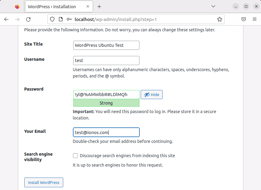 When you have filled in all the information, complete the setup and installation of WordPress on Ubuntu by clicking on “Install WordPress”. You will receive a success message and can now access the login screen for the backend at any time. All you need to do is go to the address localhost/wp-login.php, and enter your username and password.