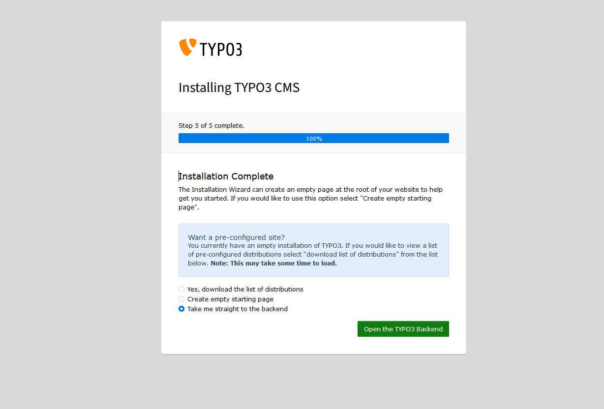 Step 17: In the final step, the assistant completes the installation by automatically adjusting some configurations to your system environment. You can decide whether TYPO3 should create an empty website or remain idle for now. By clicking “Open the TYPO3 Backend”, you will be directed to the admin area, where you can log in using the account you just created. Congratulations, you have successfully installed TYPO3!