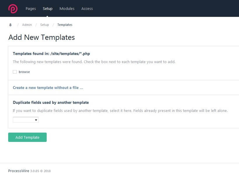 Next, go to the “Templates” menu item, which you’ll find in the settings (Setup). The templates ensure all pages with the same tasks look the same. Select “Add New Templates” from a PHP file on your server or write them down. If a template already exists (like the basic template from the downloads), you can duplicate this template for a new theme. Select a template from the drop-down menu under “Duplicate fields used by another template.” Your new template contains all fields from the original template. Existing fields are retained.