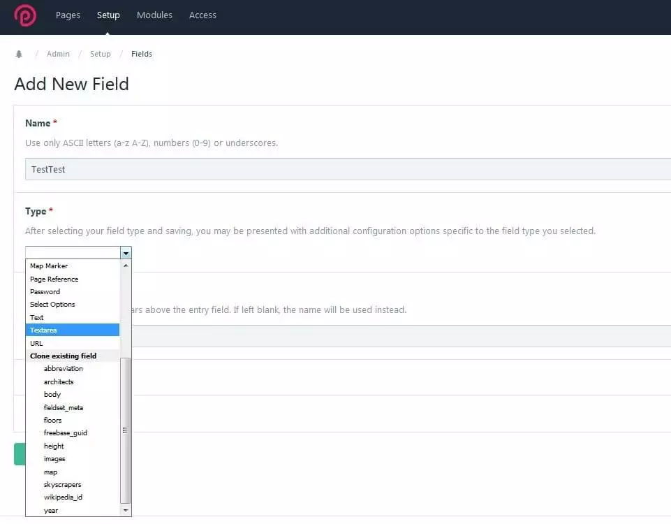 The following explanation uses screenshots from ProcessWire’s demo version. The picture above shows the back end with the page tree. Once you have set up the page, you add begin adding pages and fill them with content. But we’ll come back to that later. First, go to the neighboring tab “Setup” and select the sub item entitled “Fields.” Select “Add New” to create a new field, as shown in the following image.