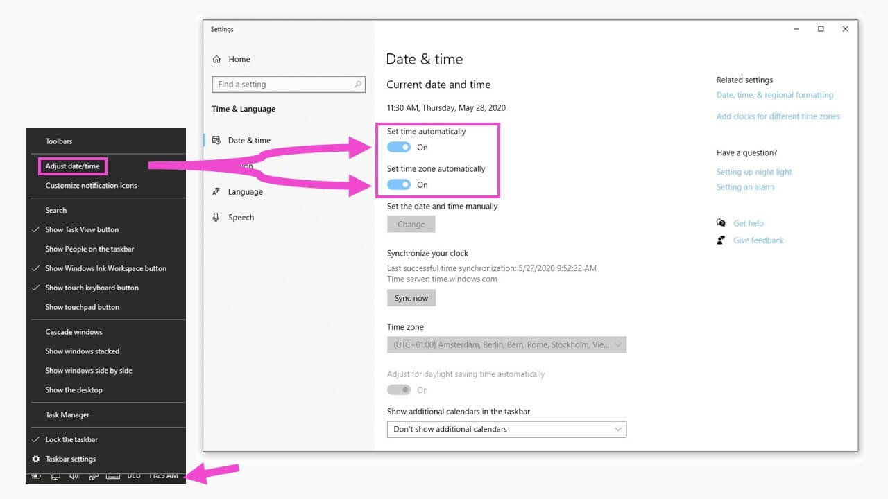 Website security certificates are valid for specific amounts of time, and they compare the period of validity of the certificate with the date and time of the computer accessing the site. An incorrectly set time on the computer can happen if it’s the first time a (new) computer has been linked to the LAN/Wi-Fi. To set the date and time on your computer, right-click on the clock in the windows task bar and choose “Adjust date/time”. This should open the Windows settings window, where you should set the time and time zone to “Set automatically”.