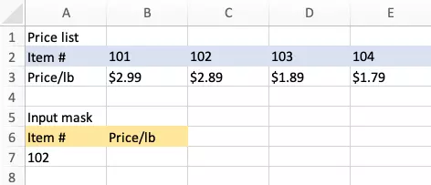 The HLOOKUP function in Excel is particularly useful when you want to look for a specific value in a large data set. This might be a directory with hundreds or thousands of entries. However, a simple example will be enough to get the basic idea across. The image below shows a price list and an input mask.