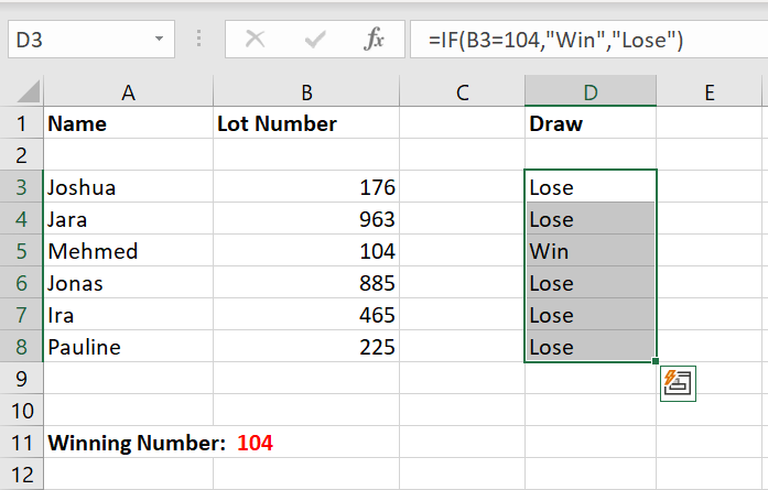 =IF(B3=104,"Win","Lose")According to this formula, if the raffle ticket number in cell B3 is equal to the winning number “104”, then the output value will be “Win”. If it is not equal to “104”, the output value will be “Lose”. You can then use the green fill handle to apply the formula to as many cells as you need.