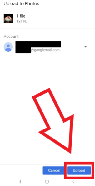 Step 3: Search for the “Upload to Photos” app. You’ll see your Google account. Tap “Upload” at the bottom right.
