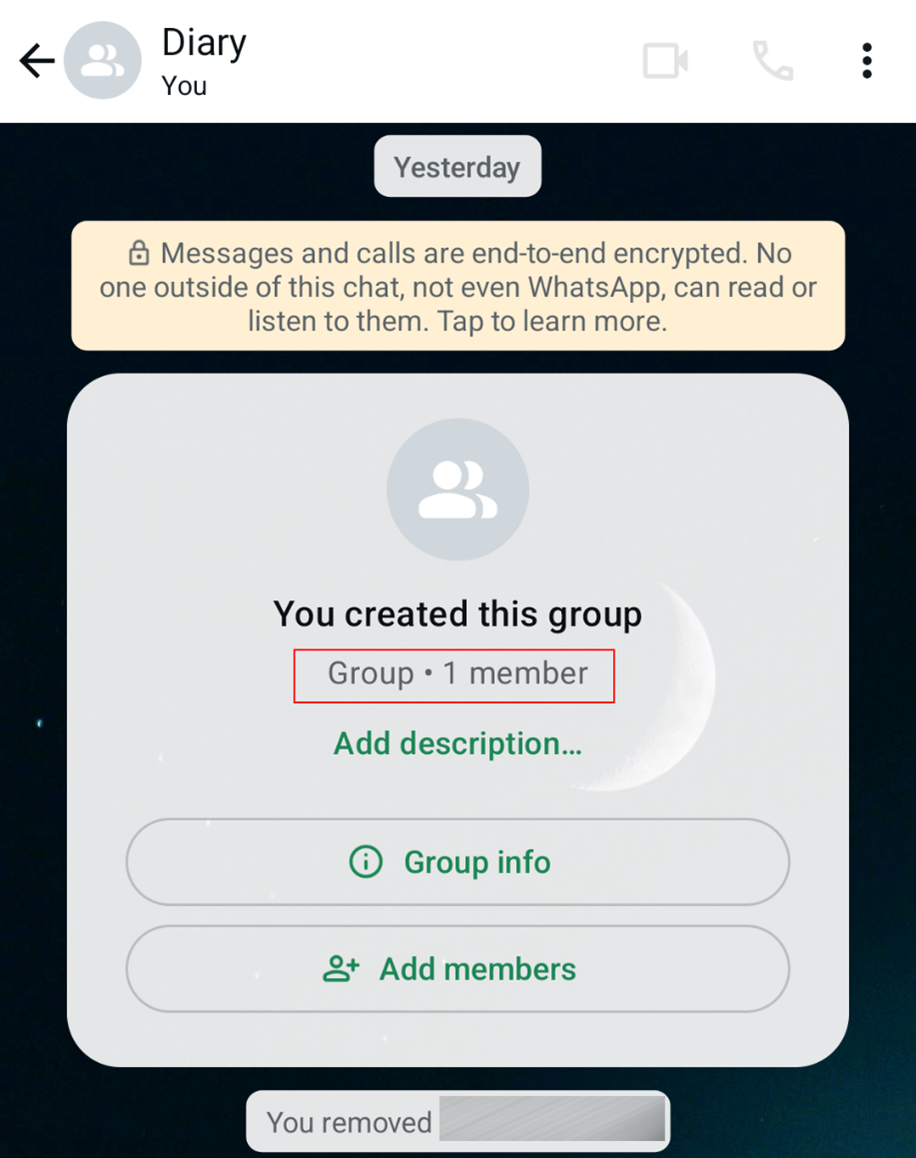 To get started, create a new WhatsApp group. Now add a contact, who ideally knows about your chat plans. Next, remove the contact and rename the group to “Diary”. Your private chat is now ready.