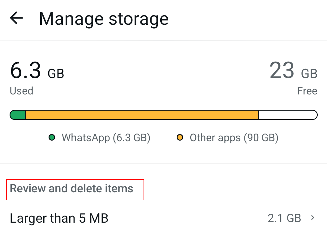 In the WhatsApp settings, select “Storage and data” and then “Manage storage”. Files with more than 5 MB will be listed there. Delete the content that takes up a lot of space and/or that you no longer need.