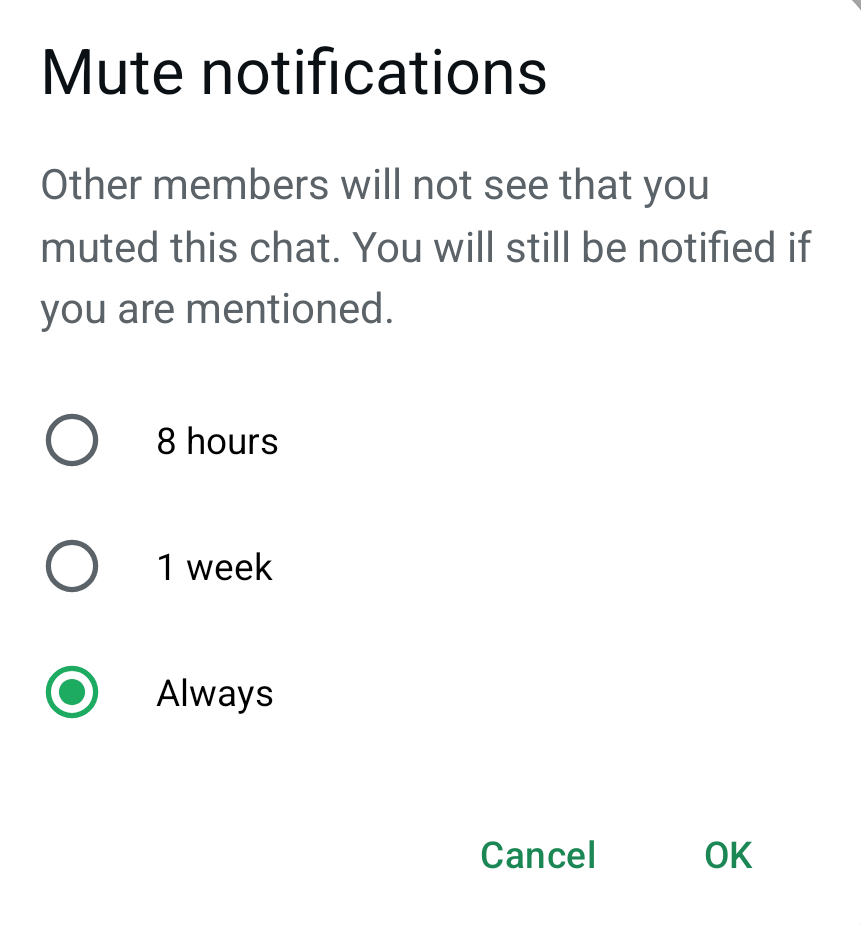First, select the chat you want to mute. Then, on Android, tap “Mute notifications” in the three-dot menu. On iOS, you can find this option in the group or contact info window. You can also hold your finger down on a chat and then activate mute. A handy feature enables you to choose to mute notifications for eight hours, one week, or indefinitely.