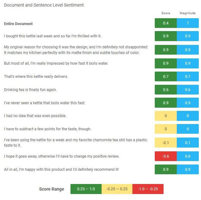 In the example below, we use a fictional review of a kettle to illustrate the limitations of automatic text analysis. The lowest-rated sentence includes the negative phrase “no idea.” Yet, when the entire review is read in context, it becomes clear that the user is actually expressing praise in that part of the text.