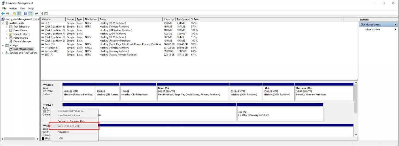 - Windows will now show you a list of the disks set up on your device, including any partitions that have been configured. Right-click on the relevant storage device and select “Convert to GPT disk”.