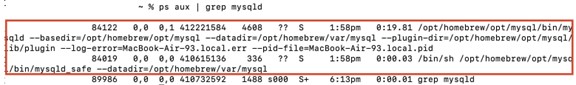 ps -aux | grep mysqlThis returns a list of running processes with “mysql” in the name. The list includes the command you just executed. If MySQL is running, it will also include the MySQL process.