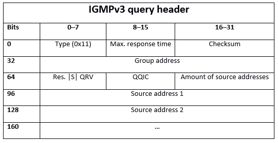 The first two 32-bit sequences are identical to those of the IGMPv2 header – type, maximum response time, checksum, and group address. IGMPv3 also offers the possibility of exchanging with older protocol versions: the codes “0x12” for version 1 and “0x16” for version 2 are available to the hosts for this purpose. After the group address, the IGMPv3 query-specific header part starts, the first 32 bits of which are composed as follows: