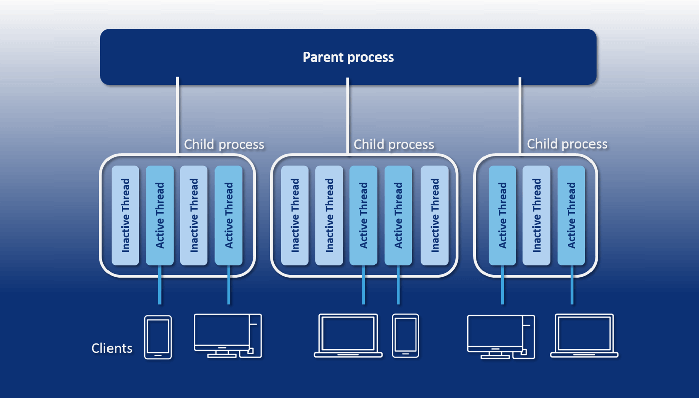 The Apache web server follows an approach where each client request is handled by a separate process or thread. With single-threading – the original operating mode of the Apache HTTP server – this is associated with I/O blocking problems sooner or later: Processes that require read or write operations are executed in strict succession. A subsequent request will remain in the queue until the previous one has been answered. This can be avoided by starting several single-threading processes at the same time – a strategy associated with high resource consumption.