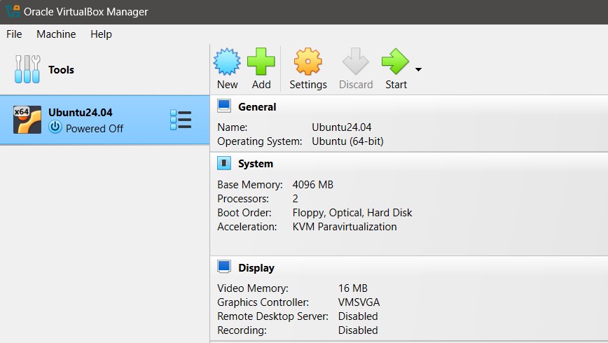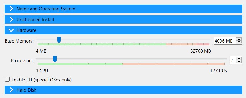 Open the next category named “Hardware.” Here you can assign a portion of the memory and processor power provided by the host system to the new virtual machine. For Ubuntu 24.04, it is recommended to reserve at least 4 GB of memory and 2 CPUs.