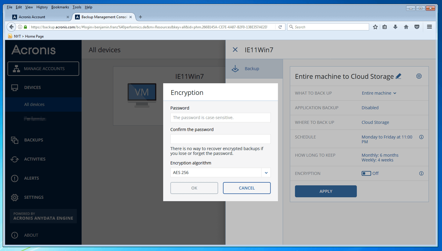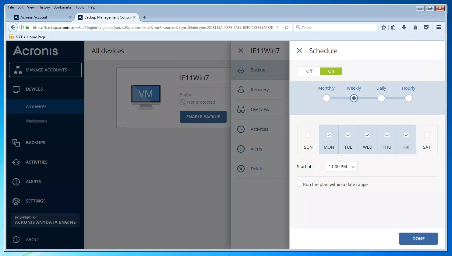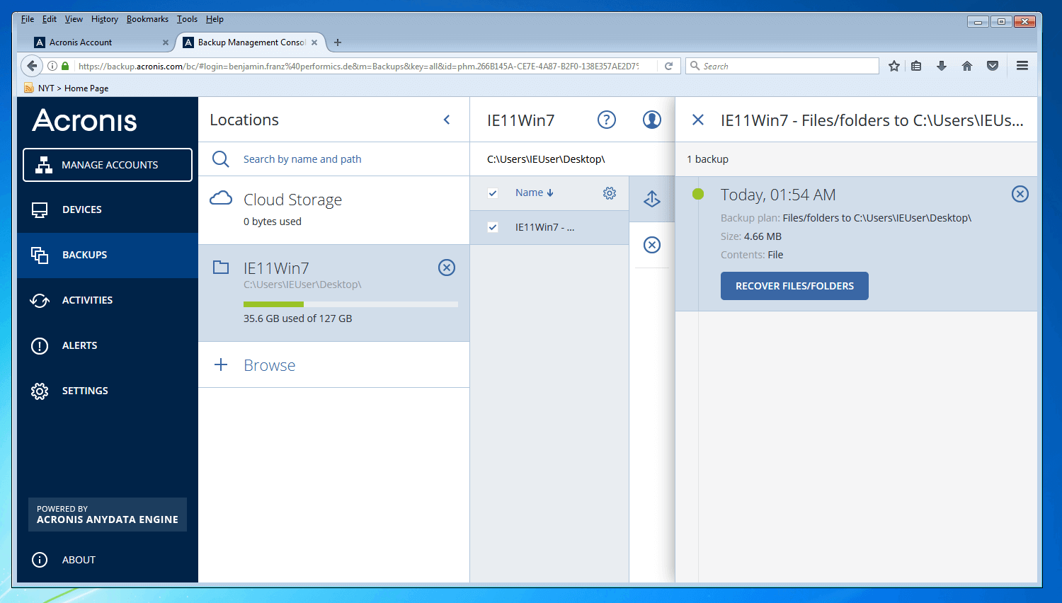 The heart of the imaging software is its backup management console, which enables the management of all systems connected to the control unit via a central administrational interface. Users obtain access to the backup management console via the cloud. A corresponding interface is found in your Acronis account after purchasing the product. Simultaneous operation of the management console is also supported on-premises.