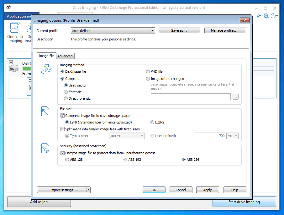 By allowing the configuration of imaging options, O&O DiskImage separates itself from the competition with the backup profile. Users have access to four predefined profiles: Default, Express, Multimedia, and Archive. The imaging software also gives the option to save customized settings for imaging methods, compression, and encryption as a user-defined profile.