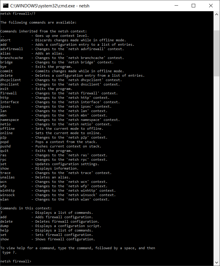 | firewall | Switches to the “netsh firewall” context | Firewall (policies and configuration) |