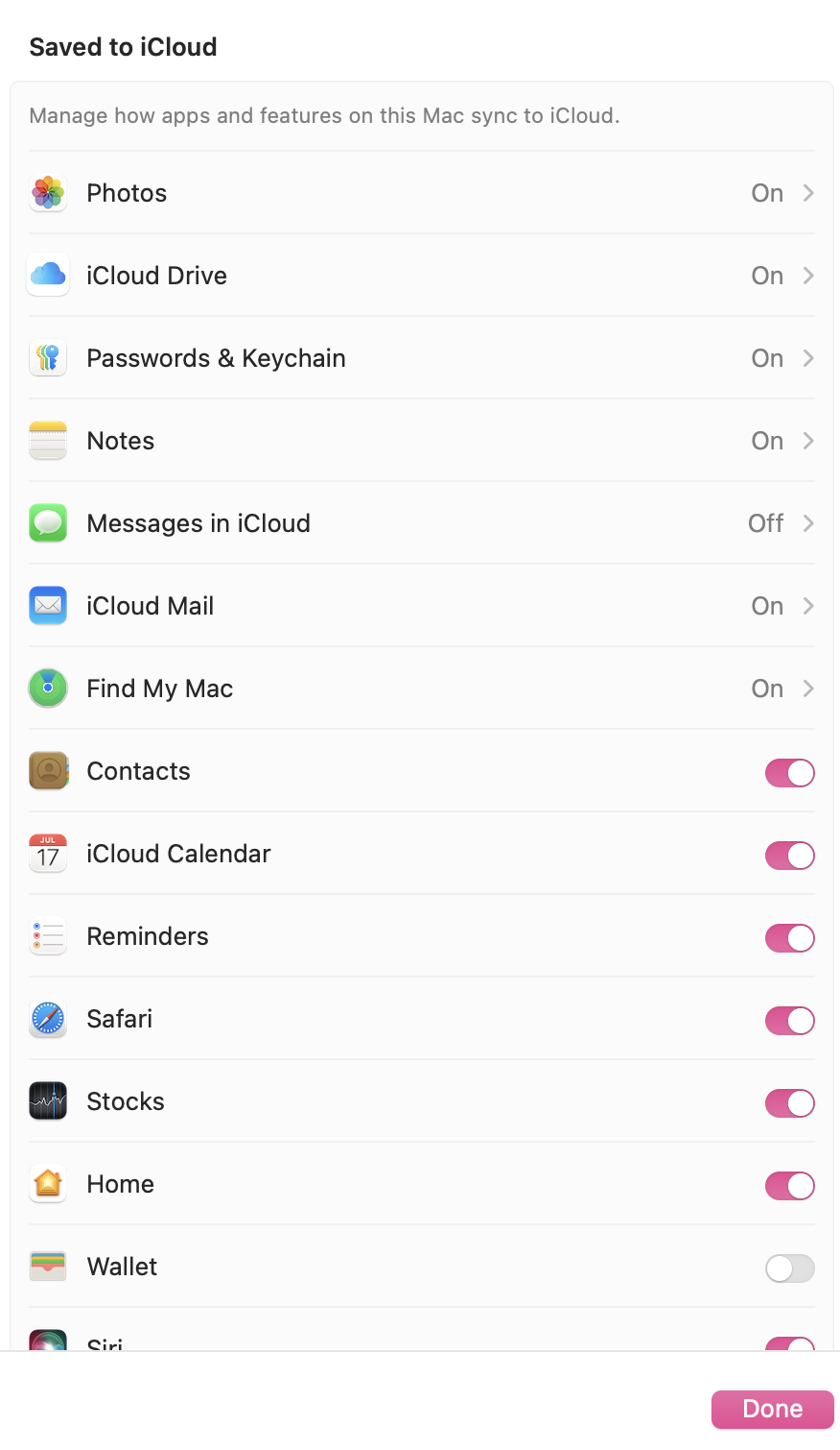 You’ll now see a menu called “Saved to iCloud”. Click on “See All” to view a list of all the available iCloud services. You can activate or deactivate each service individually by clicking the toggle. The changes will then be saved to all the Apple devices you are logged into with your Apple Account.