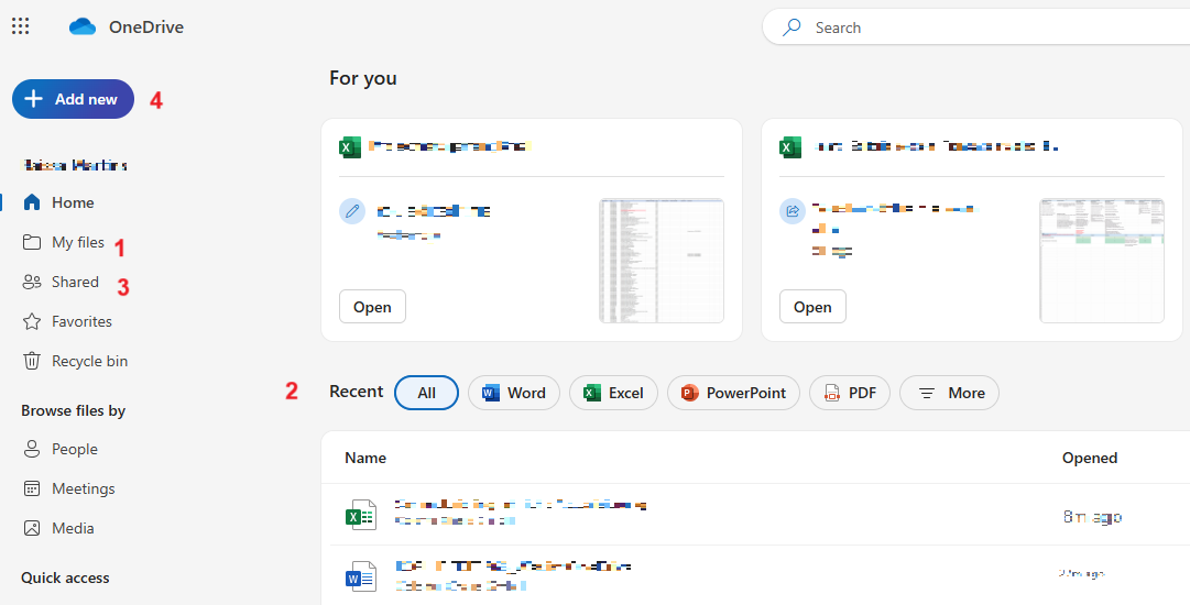 The user interface in OneDrive is basically self-explanatory and easy to use. The left side menu shows you the most important items, including your content stored in the cloud under “My files” (1). Documents and media files that you have used recently can be found under “Recently used” (2). Files that you edit or share with others are in the “Shared” folder (3). The “New” option (4) is used to create new folders or documents or to store new folders or files in the cloud.