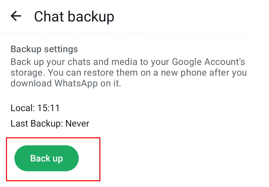 Step 9: Tap “Back up” to create your backup. Depending on the interval you selected, WhatsApp will save backups daily, weekly, or monthly — or only when you manually tap “Back up”.