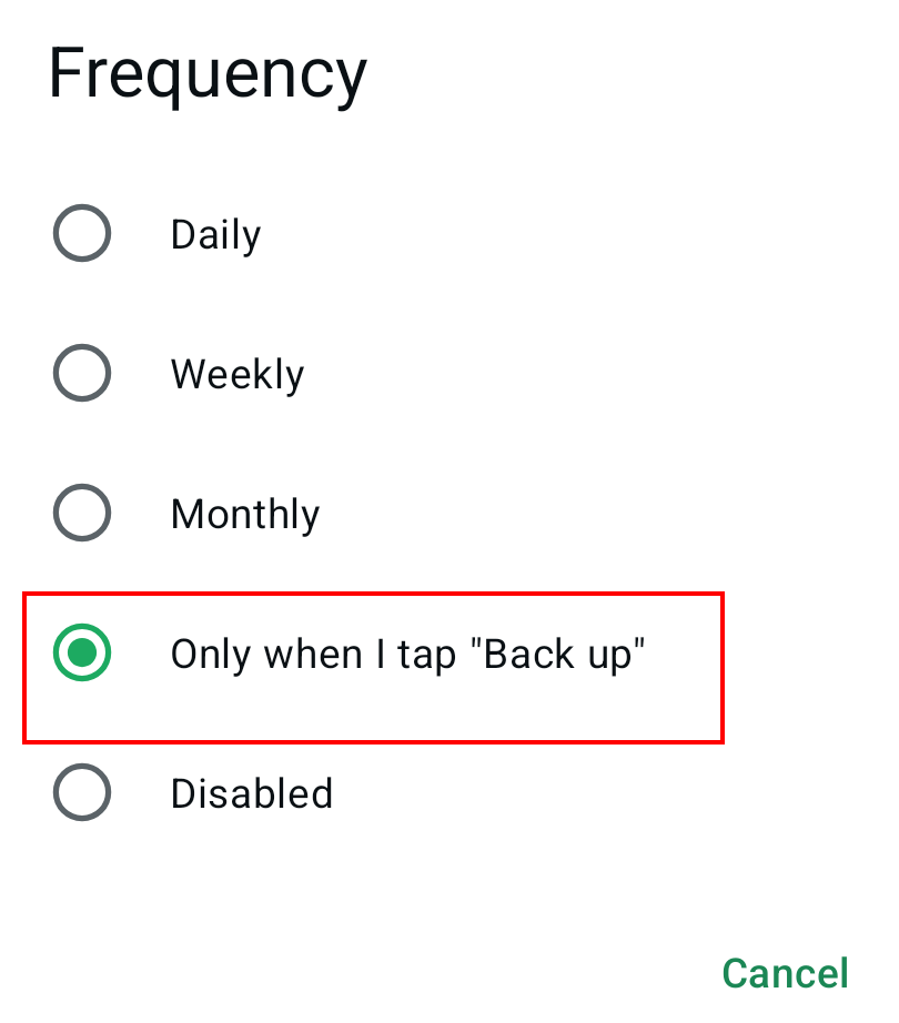Step 7: In the menu window, select the intervals at which you want to create a backup on Google Drive, or specify if you want to set up the backup manually each time (under “Only when I tap “Back up””).