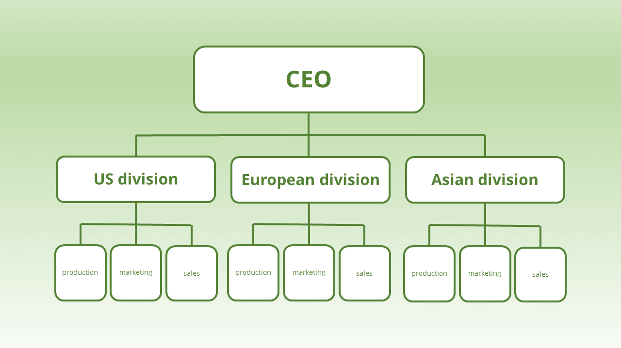 In this highly adaptable structure, each de­part­ment can con­cen­trate on its re­spec­tive field of activity and thus work faster, more strate­gi­cal­ly, and in a more co­or­di­nat­ed fashion. The resulting autonomy leads to greater employee mo­ti­va­tion. At the same time, the more dif­fer­en­ti­at­ed al­lo­ca­tion makes it possible to make in­di­vid­ual business ac­tiv­i­ties more trans­par­ent and to measure and evaluate their per­for­mance precisely. For these reasons, di­vi­sion­al or­ga­ni­za­tion­al struc­tures can be found primarily in larger companies that offer a wide range of spe­cial­ized products and services for various sales markets. A sub­di­vi­sion according to regions is par­tic­u­lar­ly suitable for in­ter­na­tion­al­ly active companies. In these cases, decision-making is usually de­cen­tral­ized.