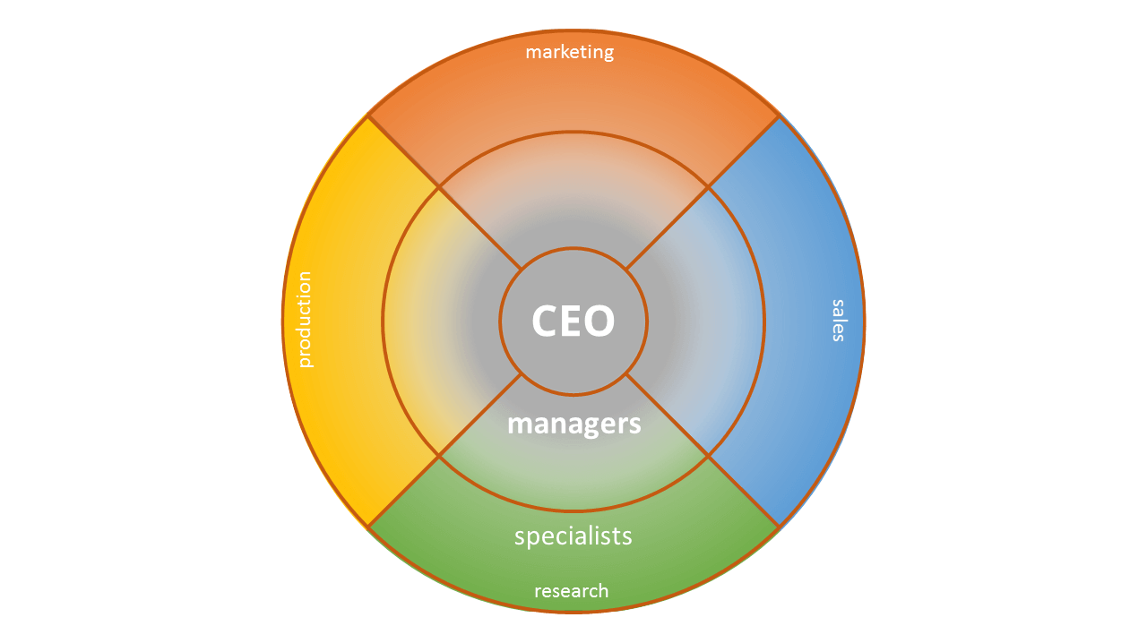 Although there is a hierarchy in this kind of or­ga­ni­za­tion chart, man­age­ment is not rep­re­sent­ed at the top, but instead in the middle of the or­ga­ni­za­tion. This implies the ideology that the CEO in­ter­venes less directly in the work of employees and instead com­mu­ni­cates their business visions from the inside out. There are only a few levels of middle man­age­ment, so in­di­vid­ual de­part­ment heads are re­spon­si­ble for more employees but the chains of command are cor­re­spond­ing­ly shorter.