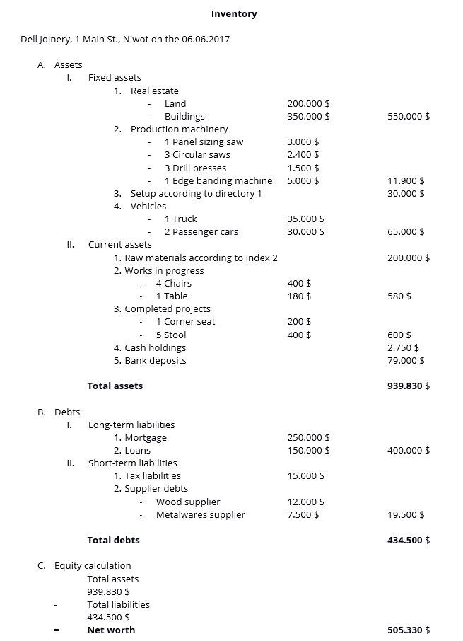 The inventory is the basis for your balance sheet. This means that findings in the inventory list are included in the balance sheet, but not the complete inventory list. While it is imperative that you specify all items individually when listing assets and liabilities, you can merge many line items in the balance sheet. They represent the assets in a compressed form.