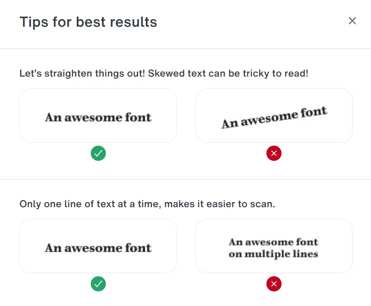 Pay attention to the Web App’s guidelines for screenshots: WhatTheFont delivers the best results with good image quality. The text section should contain enough characteristic letters of the font and be aligned as horizontally as possible. It should also be in the Latin alphabet. Moreover, try to provide a single line of text; the letters should not touch.
