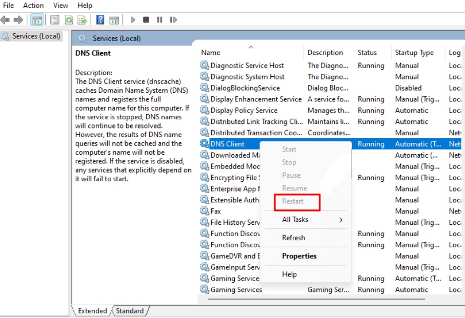 - If the service is not running, right-click the DNS Client entry and select “Restart”.