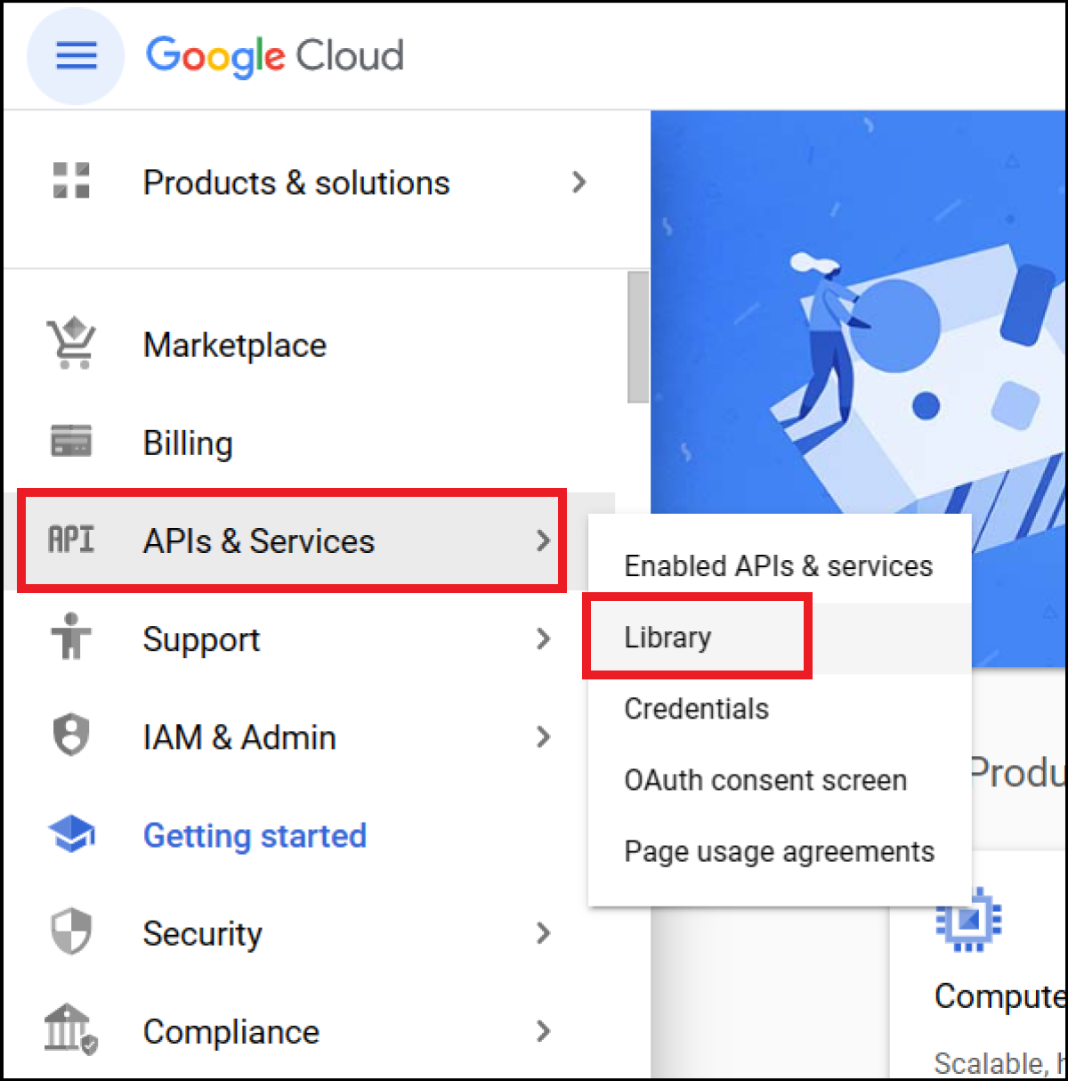 Step 1: Open the Google Cloud platform page and sign in. In the left-hand menu, choose “APIs & Services” and then “Library”.